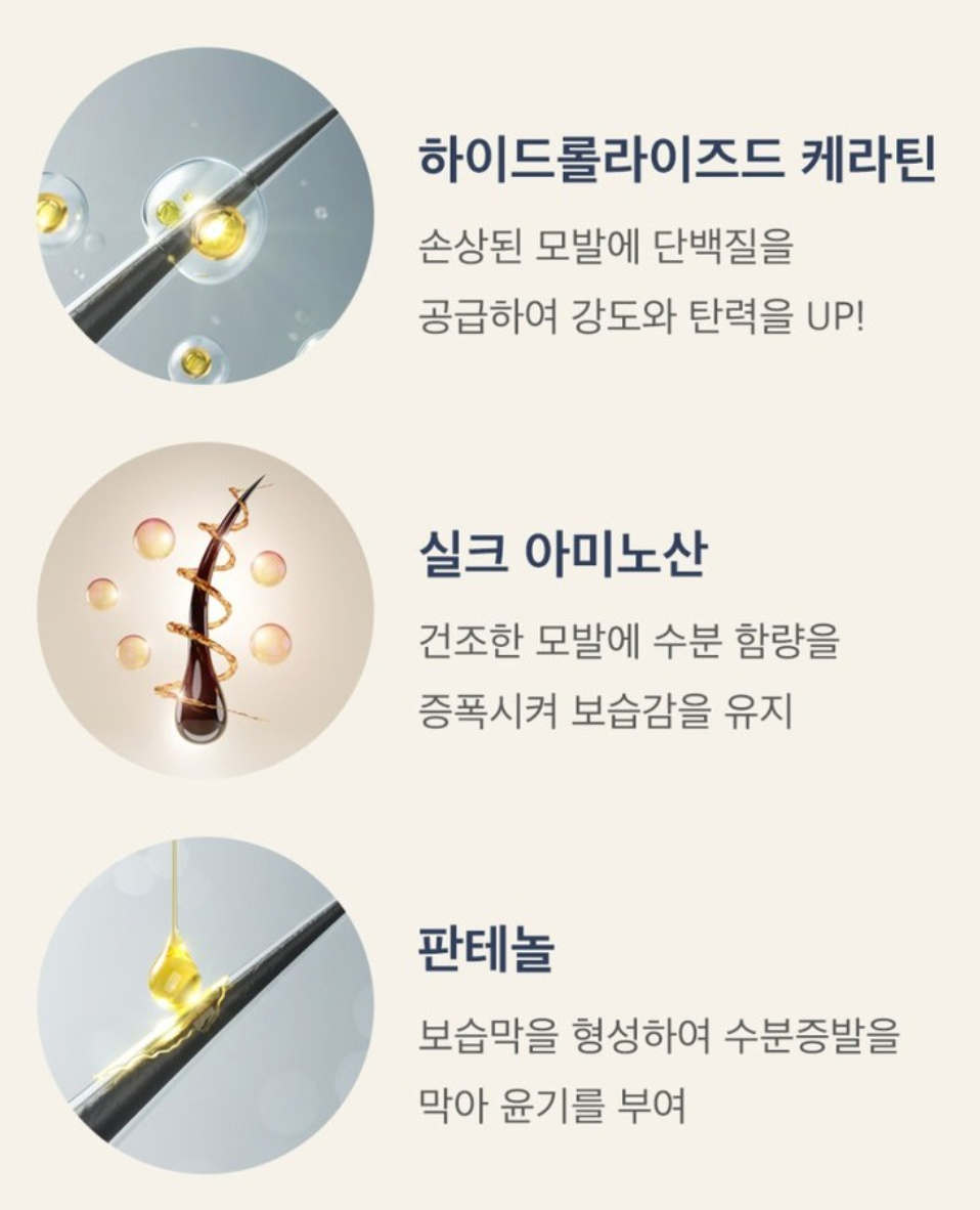 - 윤기 & 촉촉함: 수분과 영양 공급을 통해 푸석하고 건조한 모발에 윤기를 더하고 촉촉하게 유지해줍니다.