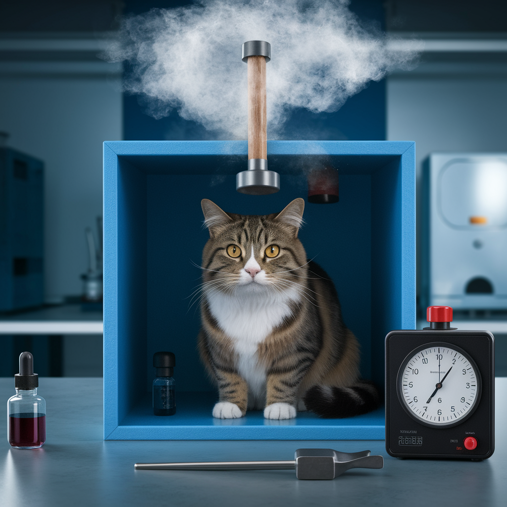 - 망치는 독가스가 담긴 유리병을 깨뜨리고, 고양이는 죽습니다.