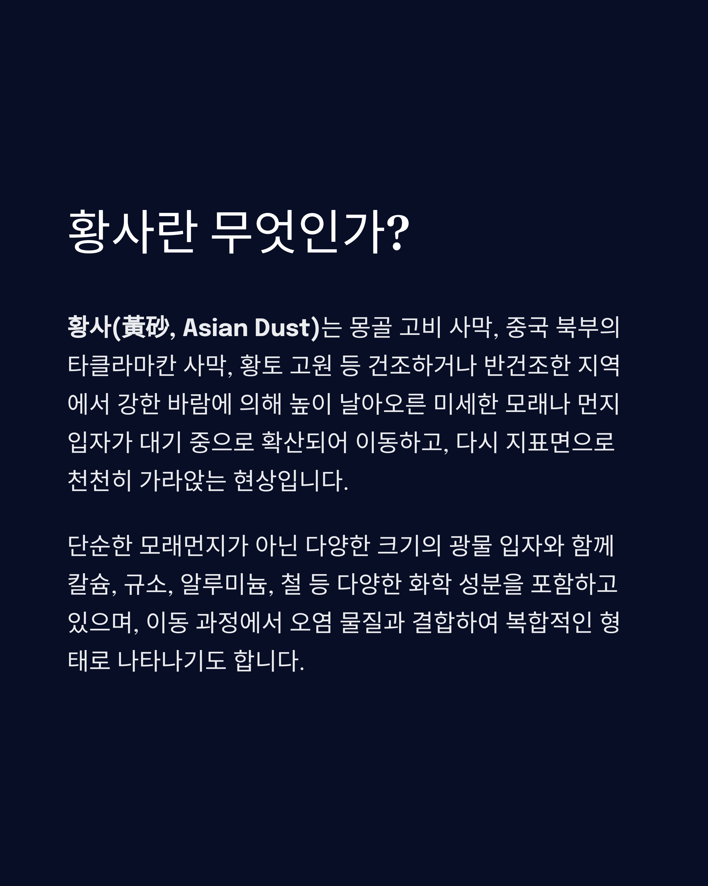 단순히 모래먼지만 생각하기 쉽지만, 황사는 다양한 크기의 광물 입자와 함께 칼슘, 규소, 알루미늄, 철 등 다양한 화학 성분을 포함하고 있습니다. 또한, 이동 과정에서 오염 물질과 결합하여 복합적인 형태로 나타나기도 합니다.