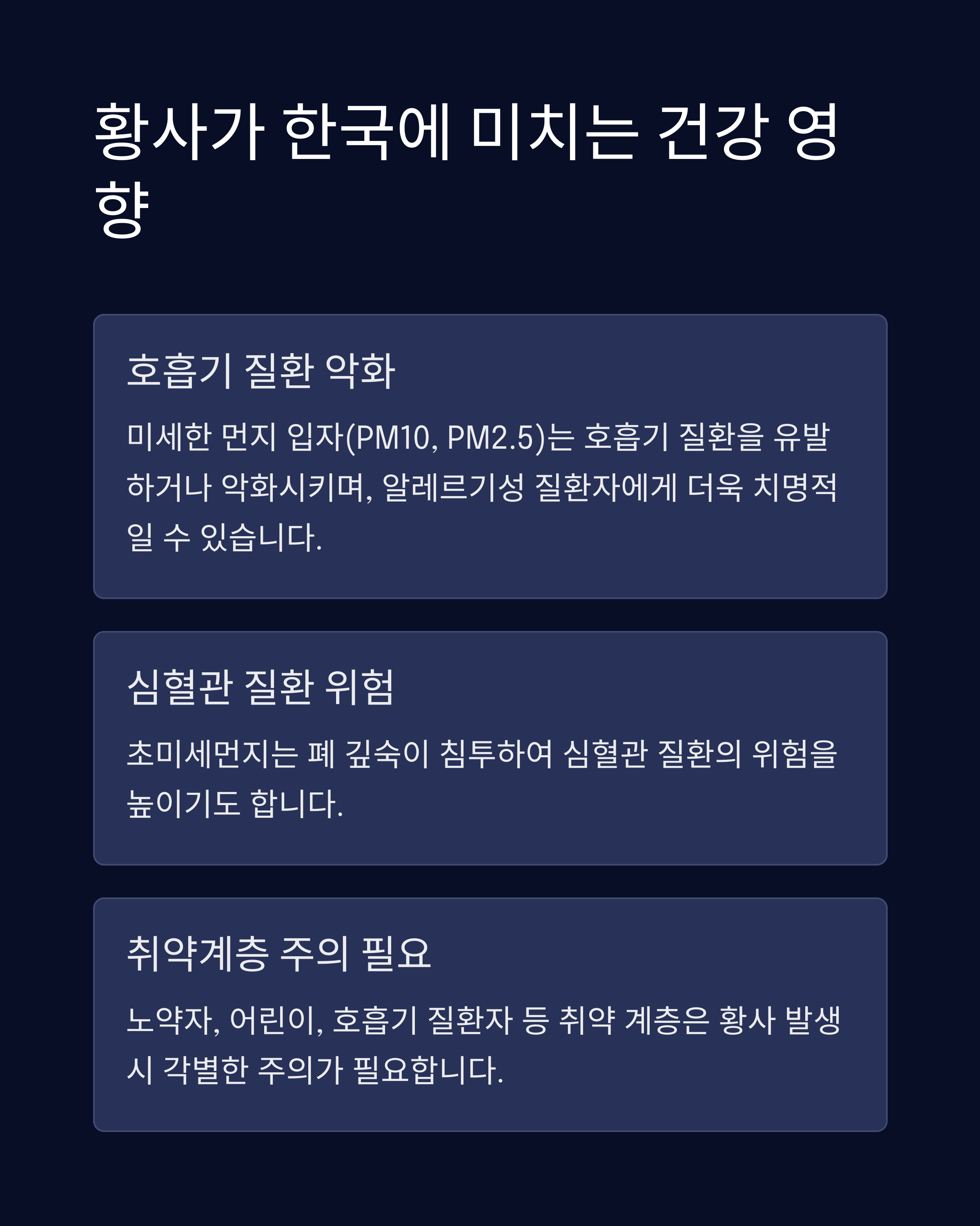 황사의 가장 직접적인 영향은 대기 질 악화입니다. 미세한 먼지 입자(PM10, PM2.5)는 호흡기 질환을 유발하거나 악화시키고, 알레르기성 질환을 가진 사람들에게는 더욱 치명적일 수 있습니다. 특히, 초미세먼지는 폐 깊숙이 침투하여 심혈관 질환의 위험을 높이기도 합니다. 따라서 황사가 심한 날에는 노약자, 어린이, 호흡기 질환자 등 취약 계층의 건강 관리에 각별한 주의가 필요합니다.