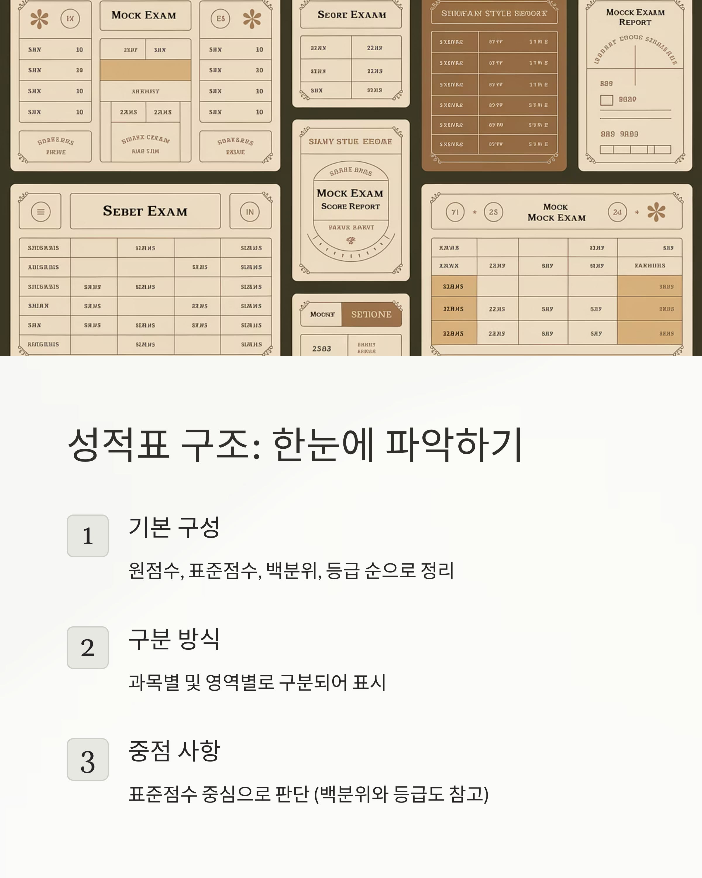 고등학생이라면 누구나 긴장되는 순간, 바로 모의고사 성적표를 받아보는 날일 것입니다. 하지만 성적표에 빼곡하게 적힌 낯선 용어들 때문에 어떻게 해석해야 할지 막막할 때가 많으셨을 텐데요. 표준점수, 백분위, 등급, 그리고 원점수까지! 이 모든 정보를 명확하게 이해하고 활용하는 방법을 알면, 자신의 학습 상황을 객관적으로 파악하고 앞으로의 학습 전략을 효과적으로 세울 수 있습니다.