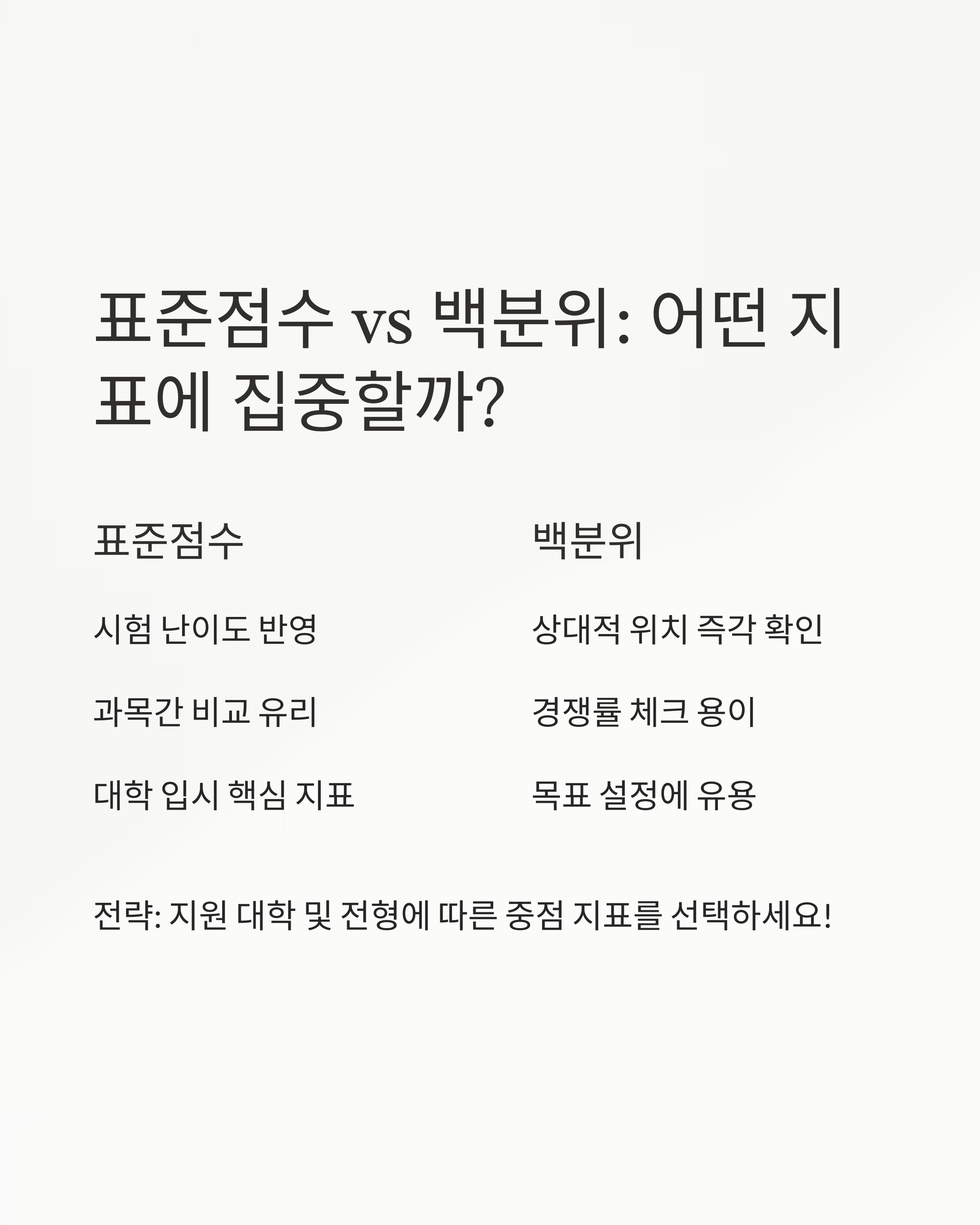 - 활용: 자신의 상대적인 실력 수준을 파악하고, 지원 대학의 점수 기준과 비교하여 합격 가능성을 예측하는 데 중요한 지표가 됩니다.