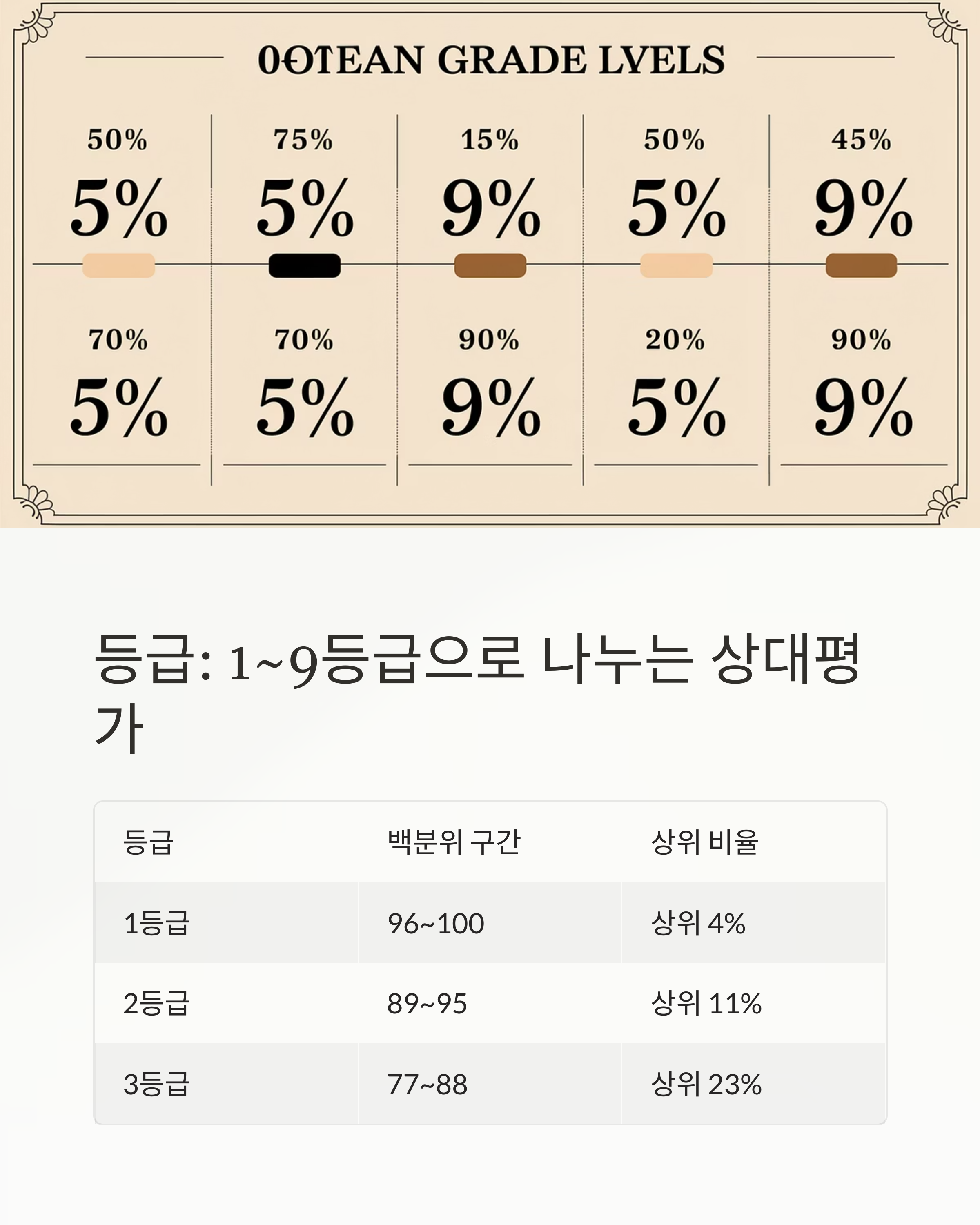 - 의미: 전체 응시자의 표준점수 분포를 일정 비율로 나누어 9개의 등급으로 표시한 것입니다.